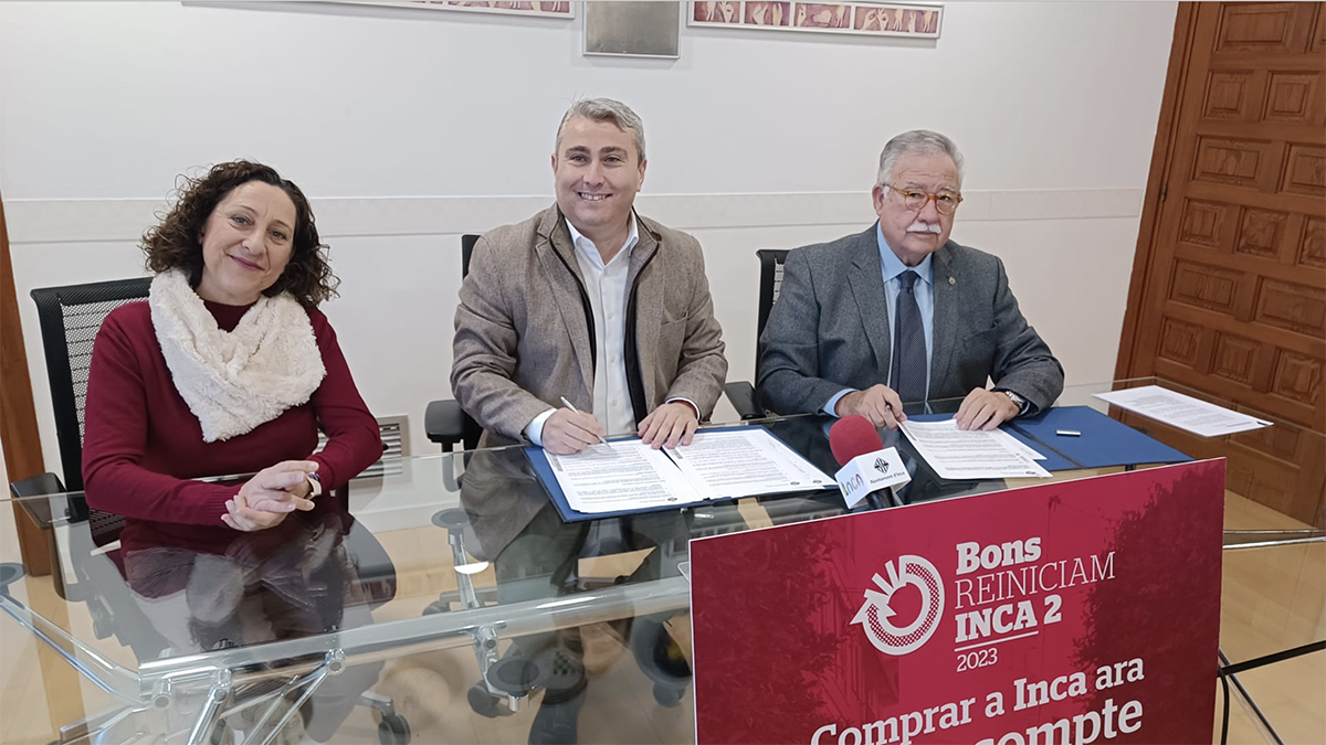 El batle d’Inca, Virgilio Moreno, i el president de la Cambra de Comerç de Mallorca, Eduardo Soriano, acompanyats de la regidora d’innovació i empresa, María José Fernández, van signar l’acord de col·laboració. D’aquesta forma, la Cambra de Comerç posa tota la infraestructura digital perquè la campanya sigui un èxit.