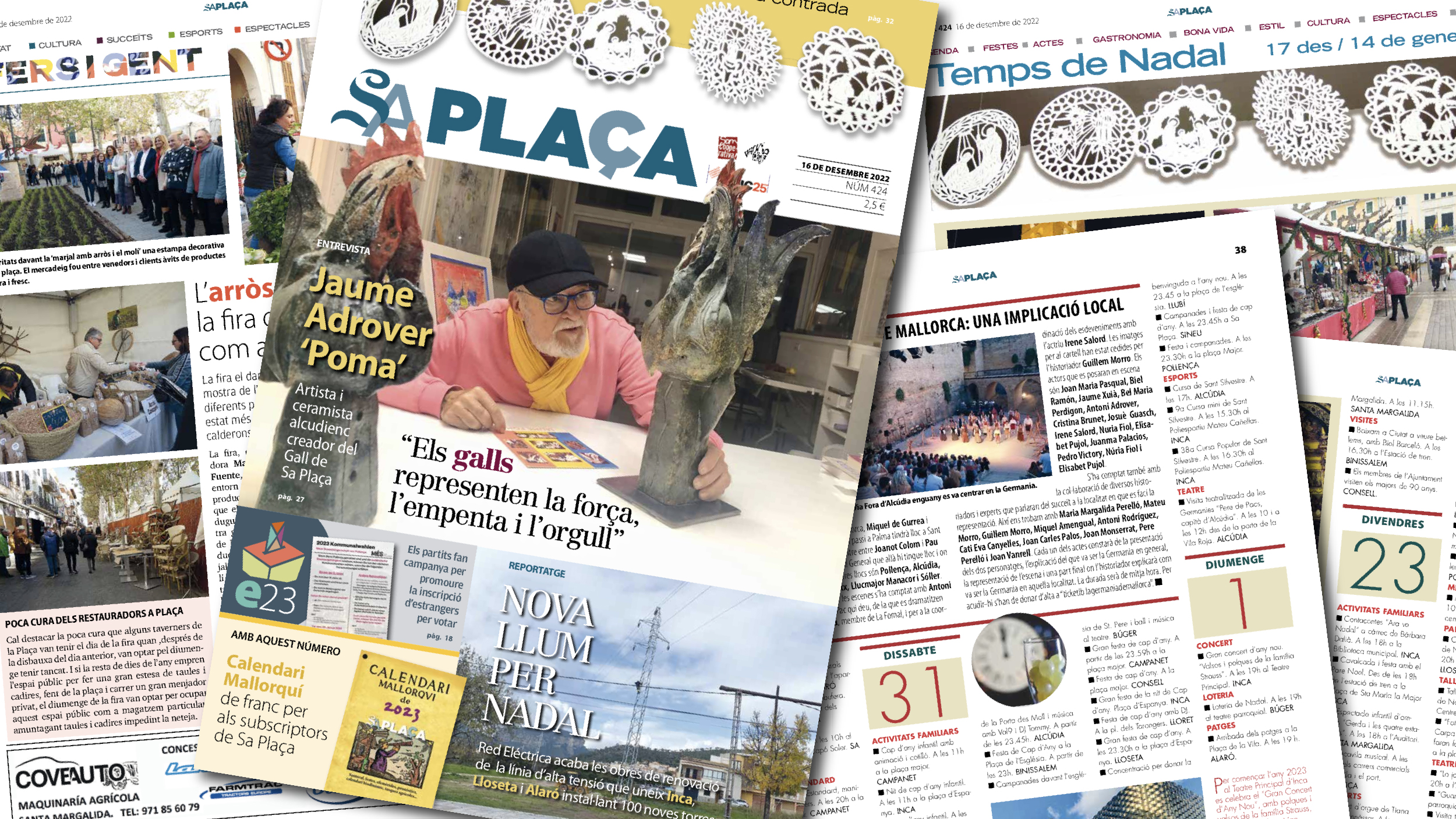 Ja teniu al carrer la revista de Sa Plaça especial festes de Nadal, amb la més completa agenda d’actes, festes, concerts, mercadets i eixides, organitzats dia per dia perquè no et perdis res. Després d’un parell d’anys de poques activitats i molt regulades, enguany recuperam un calendari d’events ben ple de compromisos i de cites rituals. Ja ho sabeu, si no teniu Sa Plaça, vos perdreu.
