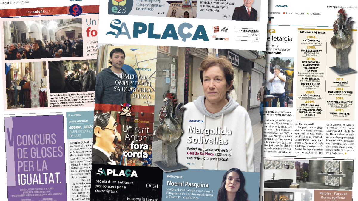 Ja tenim la revista núm 426 al carrer. Una edició que té com a tema central la distinció a la periodista Margalida Solivellas del Gall de Sa Plaça 2023. Després de cinc anys sense lliurar aquest guardó que Sa Plaça concedeix cada dos anys, tornam a reactivar el premi amb aquest reconeixement a Solivellas per la seva trajectòria professional. L’acte es farà el dissabte 11 de febrer i amb aquest motiu la revista inclou una entrevista amb la guardonada.