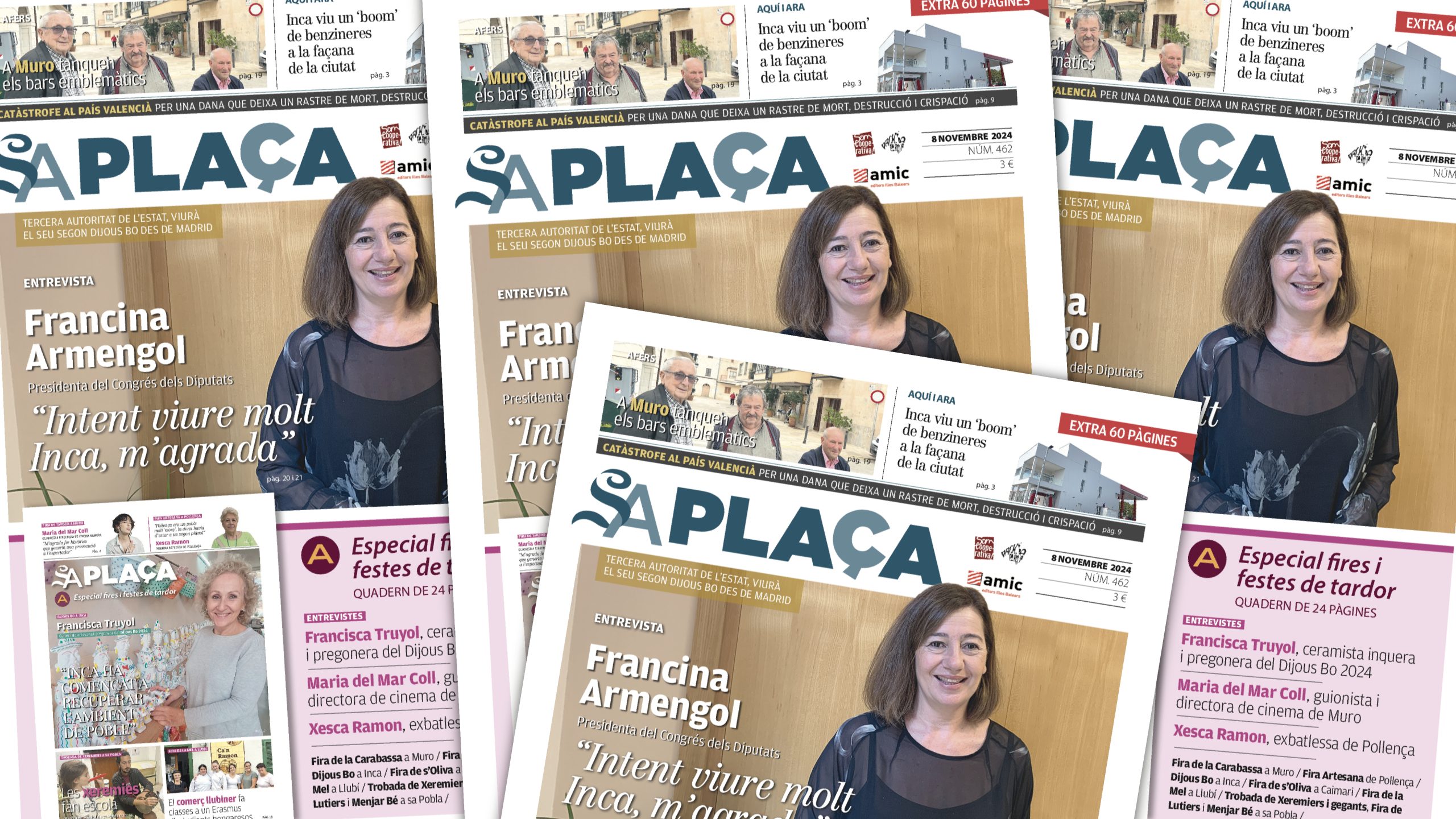 Una revista de 60 pàgines, amb un quadernet extra de 24 dedicat a fires i festes de tardor és l’aposta de la revista SA PLAÇA per aquesta arribada dels dies grans d’Inca. Una inquera que està al capdamunt de les autoritats de l’Estat, Francina Armengol, és la nostra entrevista de portada. L’expresidenta del Govern i actual presidenta del Congrés dels Diputats ens parla d’aquest seu primer any a Madrid, de com s’ha adaptat al canvi, de l’actualitat política i de com li agrada viure Inca.
