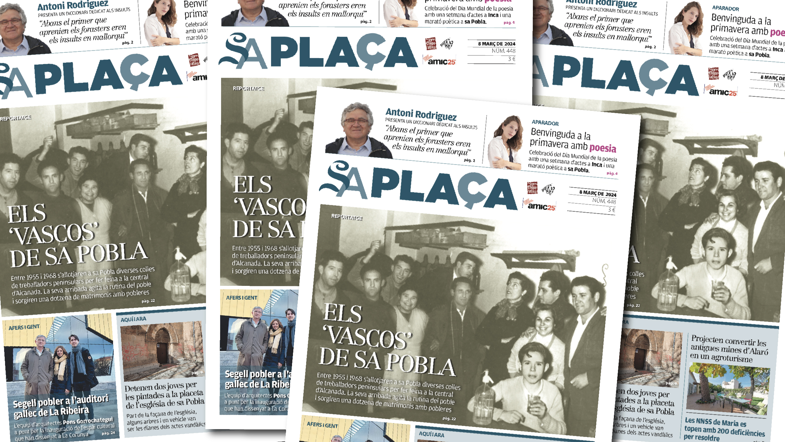 Ja podeu llegir la nova revista de Sa Plaça -número 448- als punts habituals de venda i els subscriptors la rebran a ca seva. Entre els principals temes que trobareu: la primera part d’un reportatge dedicat als ‘vascos’ de sa Pobla, que varen ser els treballadors peninsulars que a partir de 1955 passaren pel poble i molts d’ells s’hi casaren i hi quedaren. També recollim la informació de la imminent inauguració de l’auditori de La Ribeira de La Corunya, una obra de l’equip d’arquitectes pobler Pons Gorrochategui.