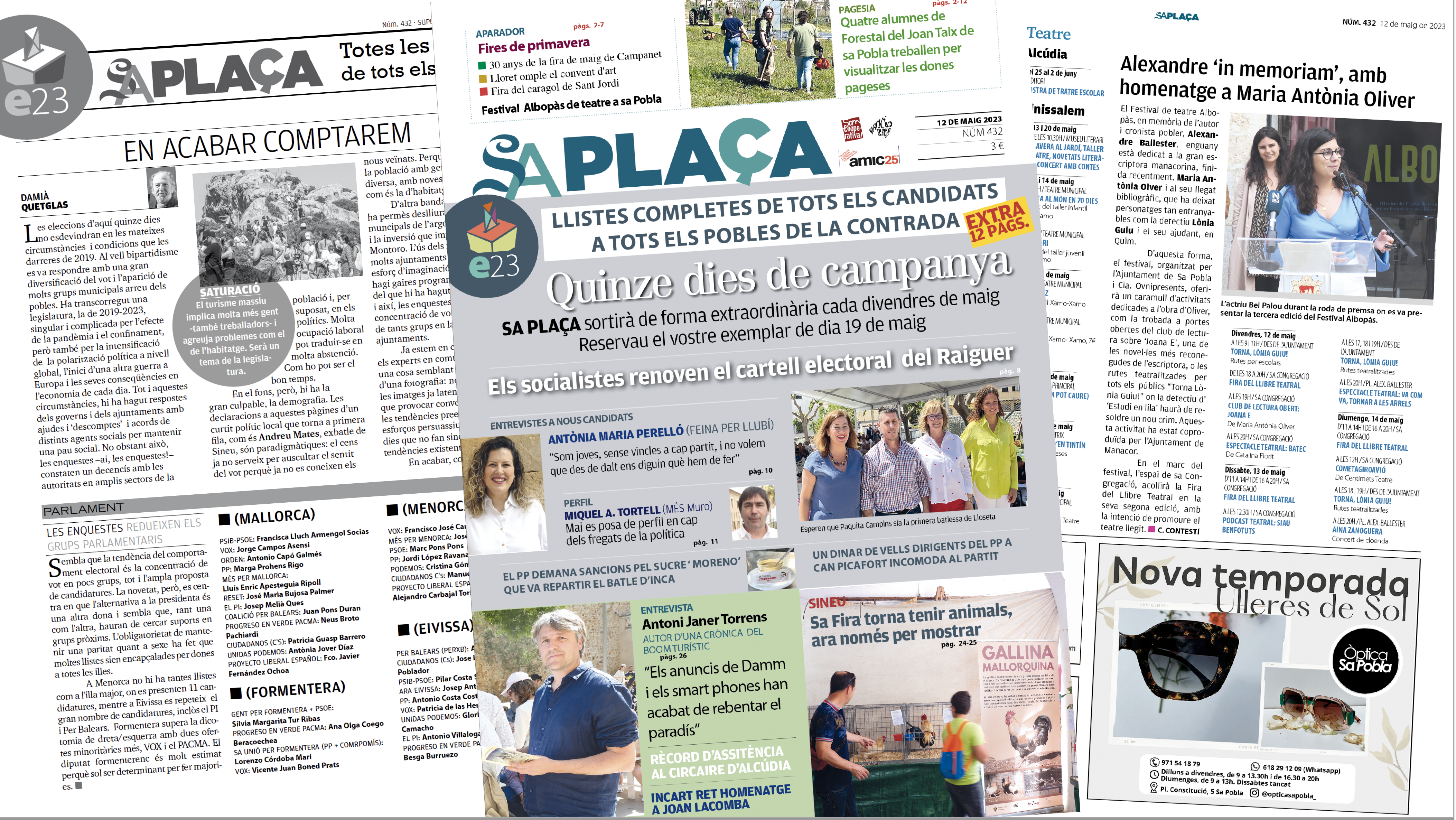 Des d’avui podeu trobar el número 432 de Sa Plaça als punts de venda habituals. En aquesta nova edició trobareu totes les novetats polítiques, per la campanya electoral que s’acaba d’encetar, així com un especial amb totes les llistes de cada poble, per poder fer un bon seguiment de les eleccions.